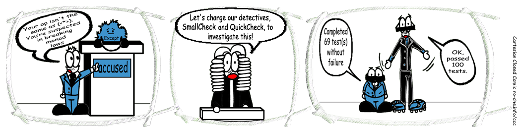 And the new strip is dedicated to the weirdness of Except (aka Either) monad with respect to its Applicative instance, pointed out here. Also inspired by the quote by Daveman.